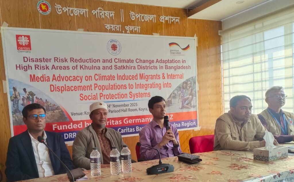 জলবায়ু পরিবর্তনে সবচেয়ে ঝুঁকিতে থাকা দেশের উপকূলীয় অঞ্চল কয়রায় অভিযোজন-স্থানান্তরিত জনগোষ্ঠীর জন্য সামাজিক সুরক্ষা শক্তিশালীকরণের লক্ষ্যে একটি কর্মশালা অনুষ্ঠিত হয়েছে। সোমবার সকাল ১০টায় কয়রা উপজেলা পরিষদ হলরুমে এই মিডিয়া অডভোকেসি সভার আয়োজন করে কারিতাস খুলনা অঞ্চল।