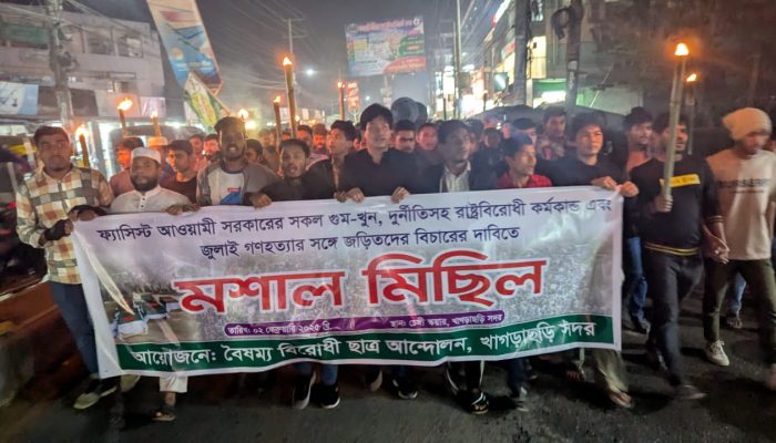 খাগড়াছড়িতে বৈষম্য বিরোধী ছাত্র আন্দোলনে মশাল মিছিল