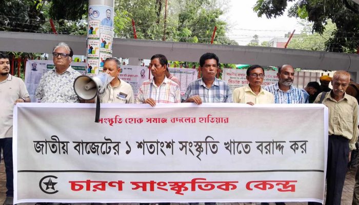 জাতীয় বাজেটের ১ শতাংশ সংস্কৃতি খাতে বরাদ্দের দাবিতে চারণ সাংস্কৃতিক কেন্দ্রের উদ্যোগে ২৬ জুন ২০২৪ সকাল ১১:৩০টায় জাতীয় প্রেসক্লাবের সামনে মানববন্ধন অনুষ্ঠিত হয়। চারণের কেন্দ্রীয় সভাপতি নিখিল দাসের সভাপতিত্বে এবং সাধারণ সম্পাদক জাকির হোসেনের সঞ্চালনায় মানববন্ধনে বক্তব্য রাখেন সংগঠনের কেন্দ্রীয় সহসভাপতি কবি কামরুজ্জামান ভূইয়া, বিপুল চন্দ্র দাস, জসিম, উদ্দিন প্রদীপ সরকার।