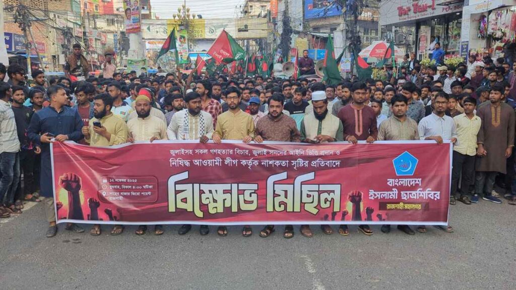 দেশব্যাপী “জুলাইসহ সব গণহত্যার বিচার” এবং “জুলাই সনদকে আইনি স্বীকৃতি” প্রদানের দাবিতে রাজশাহীতে বিক্ষোভ মিছিল ও সমাবেশ করেছে ইসলামী ছাত্রশিবির। বুধবার বিকেলে নগরীর সাহেব বাজার জিরো পয়েন্টে রাজশাহী মহানগর শাখার উদ্যোগে আয়োজিত এ কর্মসূচিতে অংশ নেন সংগঠনের বিভিন্ন পর্যায়ের নেতাকর্মীরা।