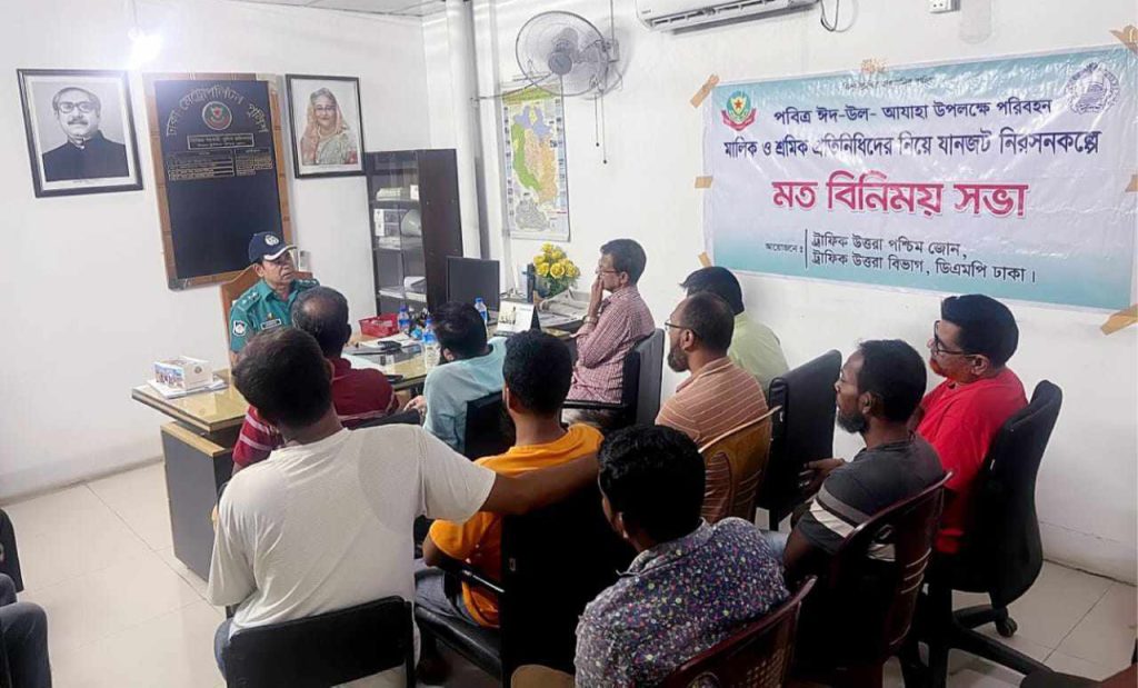 আসন্ন পবিত্র ঈদ-উল-আযহা ২০২৪ উপলক্ষে ১০-০৬-২০২৪ খ্রি. ট্রাফিক উত্তরা পশ্চিম জোন অফিসে মো: ফেরদাউস হোসেন সহকারী পুলিশ কমিশনার ট্রাফিক উত্তরা পশ্চিম জোন ট্রাফিক উত্তরা বিভাগ এর নেতৃত্বে বাস মালিক সমিতির আব্দুল্লাহপুর শাখার সাধারণ সম্পাদক জনাব মোঃ নূরুল ইসলাম (নূরু) এবং দপ্তর সম্পাদক জনাব তৌহিদুল ইসলাম (টুকন)সহ শ্রমিক সমিতির কতিপয় ব্যক্তিবর্গদের নিয়ে ট্রাফিক উত্তরা বিভাগের সম্মানিত উপ পুলিশ কমিশনার জনাব নাবিদ কামাল শৈবাল পিপিএম-সেবা (অতিরিক্ত উপ-পুলিশ মহাপরিদর্শক) এর নির্দেশে ও অতিরিক্ত উপ-পুলিশ কমিশনার মোঃ কামরুজ্জামান পিপিএম-সেবা স্যারের দিকনির্দেশনায় একটি ট্রাফিক সচেতনতামূলক মতবিনিময় সভার আয়োজন করা হয়।