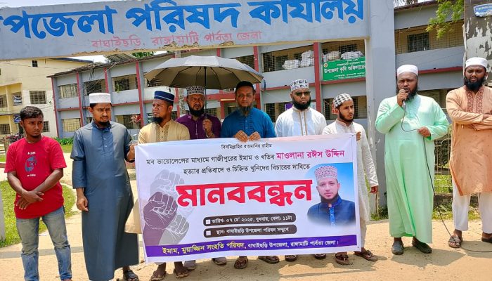 রাঙ্গামাটি বাঘাইছড়িতে মব ভায়োলেন্সের মাধ্যমে গাজীপুরের ইমাম ও খতিব মাওলানা রঈস উদ্দিনের হত্যার প্রতিবাদে ও চিহ্নিত খুনিদের বিচারের দাবিতে মানববন্ধন অনুষ্ঠিত হয়েছে।