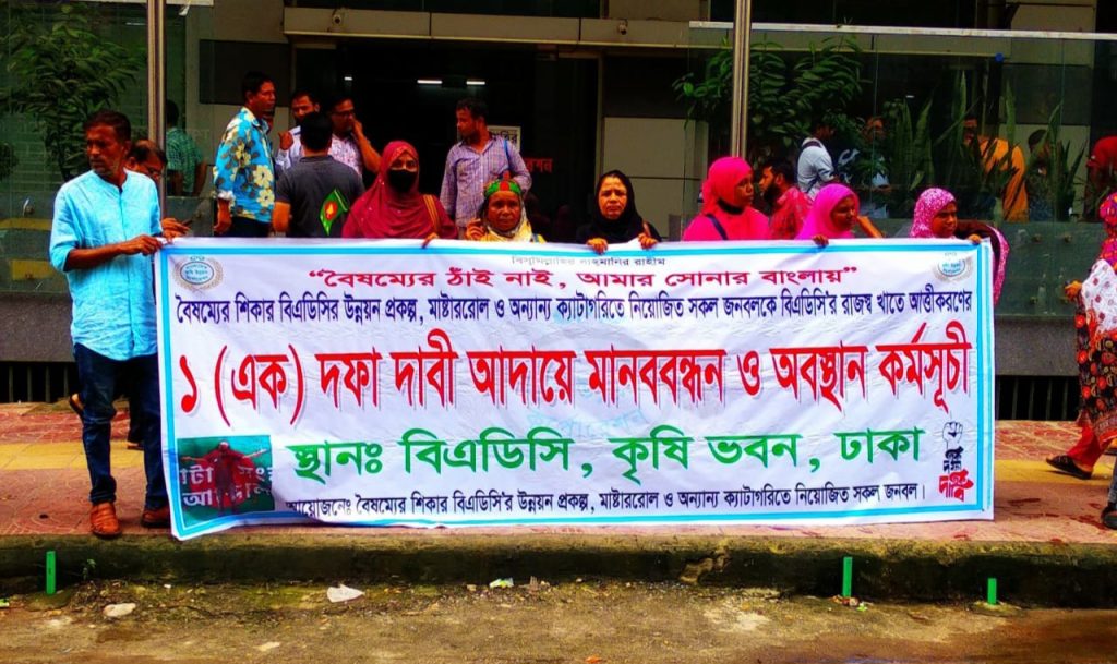 Thank you for reading this post, don't forget to subscribe!জানা যায়, সারাদেশে বিএডিসিতে কর্মরত বৈষ্যমের শিকার শ্রমিক-কর্মচারীরা বিএডিসির উন্নয়ন প্রকল্প, মাস্টাররোল ও অন্যান্য ক্যাটাগরিতে নিয়োজিত সকল জনবলকে বিএনডিসি’র রাজস্ব খাতে আত্তায়ীকরণের দাবিতে ‘ বৈষম্যের ঠাঁই নাই, আমার সোনার বাংলায়’ শ্লোগানে মানববন্ধন ও অবস্থান কর্মসূচীদের অংশ নেন।
