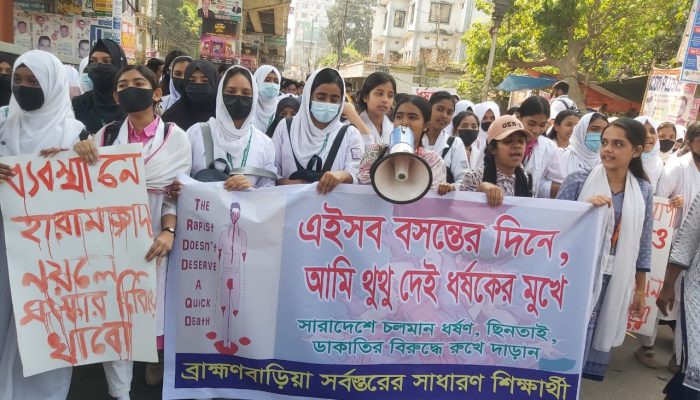 সারাদেশে সংগঠিত হওয়া ধর্ষণ হত্যা ও আইনশৃঙ্খলার অবনতির বিরুদ্ধে ব্রাহ্মণবাড়িয়ায় সর্বস্তরের সাধারণ শিক্ষার্থীর মানববন্ধন ও বিক্ষোভ মিছিল অনুষ্ঠিত হয়েছে।