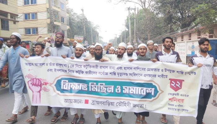 আল্লাহ ও তাঁর রাসূলের ব্যাপারে কটুক্তিকারী রাখাল রাহা ও হাসান গালিবের গ্রেফতার সহ উপযুক্ত শাস্তি এবং ইসলামকে নিয়ে কটুক্তি কারীদের সর্বোচ্চ শাস্তি সংবিধানে প্রণয়নের দাবীতে ব্রাহ্মণবাড়িয়ায় বিক্ষোভ মিছিল অনুষ্ঠিত হয়েছে।