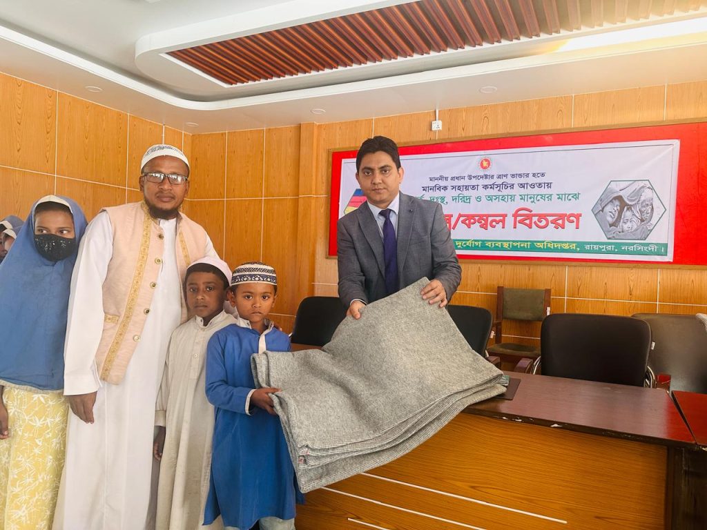 Thank you for reading this post, don't forget to subscribe!মঙ্গলবার ৭ জানুয়ারি দুপুরে নরসিংদীর রায়পুরা উপজেলায় প্রধান উপদেষ্টার ত্রাণ ভান্ডার হতে মানবিক সহায়তা কর্মসূচির আওতায় শীতার্ত দু:স্থ, দরিদ্র, অসহায় মানুষ ও বিভিন্ন এতিমখানায় এতিম শিশুর মাঝে উপজেলা প্রশাসনের পক্ষ ৫০০ শত কম্বল দেওয়া হয়।