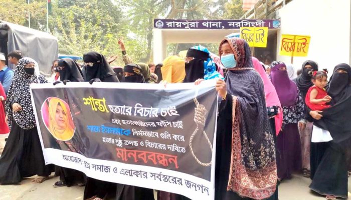 নরসিংদীর রায়পুরা উপজেলার শ্রীনগরে শান্তা ইসলাম (২৪) নামে এক অন্তঃসত্ত্বা গৃহবধূ হত্যার ৯ দিন পেরিয়ে গেলেও মামলার প্রধান আসামি সোহেলসহ অন্যদের গ্রেপ্তার করতে পারেনি পুলিশ। এতে ক্ষোভে ফেটে পড়েছে নিহতের স্বজন ও এলাকাবাসী। আসামিদের দ্রুত গ্রেপ্তারের দাবিতে তারা মানববন্ধন ও রায়পুরা থানা ঘেরাও করে।
