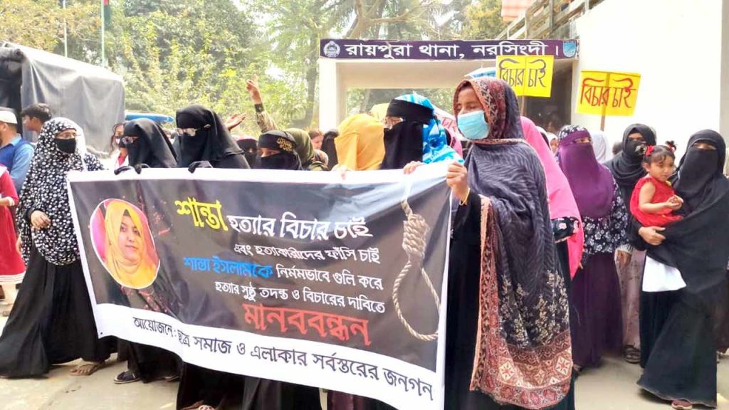 নরসিংদীর রায়পুরা উপজেলার শ্রীনগরে শান্তা ইসলাম (২৪) নামে এক অন্তঃসত্ত্বা গৃহবধূ হত্যার ৯ দিন পেরিয়ে গেলেও মামলার প্রধান আসামি সোহেলসহ অন্যদের গ্রেপ্তার করতে পারেনি পুলিশ। এতে ক্ষোভে ফেটে পড়েছে নিহতের স্বজন ও এলাকাবাসী। আসামিদের দ্রুত গ্রেপ্তারের দাবিতে তারা মানববন্ধন ও রায়পুরা থানা ঘেরাও করে।