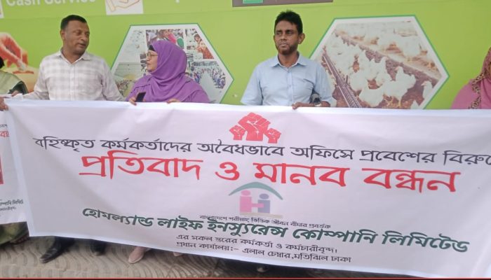 সোমবার সকালে ১০২৫ ঘটিকা থেকে হোমল্যান্ড লাইফ ইন্স্যুরেন্স কোম্পানি লিমিটেডের প্রায় ৪০–৫০ জন কর্মকর্তা ও কর্মচারী প্রধান কার্যালয়ের সামনে অবৈধভাবে বহিষ্কৃত কর্মকর্তাদের অফিস দখলের বিরুদ্ধে প্রতিবাদে রাস্তায় নামেন। মানববন্ধনের মাধ্যমে তারা কোম্পানির চলমান অভ্যন্তরীণ কোন্দল, শেয়ার জালিয়াতি, ও কর্তৃপক্ষের দুর্বল নজরদারির তীব্র নিন্দা জানান।