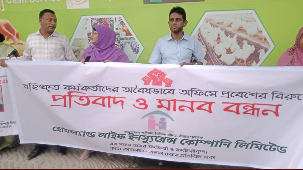 সোমবার সকালে ১০২৫ ঘটিকা থেকে হোমল্যান্ড লাইফ ইন্স্যুরেন্স কোম্পানি লিমিটেডের প্রায় ৪০–৫০ জন কর্মকর্তা ও কর্মচারী প্রধান কার্যালয়ের সামনে অবৈধভাবে বহিষ্কৃত কর্মকর্তাদের অফিস দখলের বিরুদ্ধে প্রতিবাদে রাস্তায় নামেন। মানববন্ধনের মাধ্যমে তারা কোম্পানির চলমান অভ্যন্তরীণ কোন্দল, শেয়ার জালিয়াতি, ও কর্তৃপক্ষের দুর্বল নজরদারির তীব্র নিন্দা জানান।