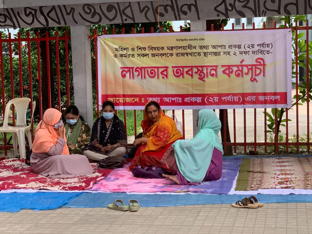 জাতীয় প্রেসক্লাবের সামনে চলমান রয়েছে “তথ্য আপা প্রকল্প (২য় পর্যায়)” এর কর্মরত জনবলদের রাজস্বখাতে স্থানান্তরের দাবিতে অবস্থান কর্মসূচি।