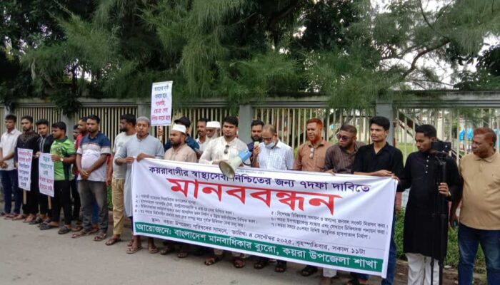 Thank you for reading this post, don't forget to subscribe!বৃহস্পতিবার সকালে উপজেলা পরিষদ চত্বরে বাংলাদেশ মানবাধিকার ব্যুরো’র কয়রা শাখার উদ্যোগে আয়োজিত এ মানববন্ধনে বিভিন্ন সামাজিক সংগঠনের নেতৃবৃন্দ, স্থানীয় বিশিষ্টজন ও সাধারণ মানুষ অংশ নেন। মানববন্ধন শেষে স্বাস্থ্য অধিদপ্তরের মহাপরিচালকের কাছে প্রেরণের জন্য কয়রা উপজেলা নির্বাহী কর্মকর্তা মো. আব্দুল্লাহ আল বাকীর হাতে একটি স্মারকলিপি তুলে দেওয়া হয়।