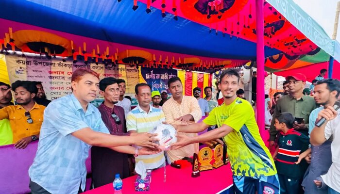 Thank you for reading this post, don't forget to subscribe!উপজেলা কাঁকড়া ব্যবসায়ী কল্যাণ সমিতির সভাপতি ও যুবদল নেতা আহাদুর রহমান লিটনের সভাপতিত্বে আয়োজিত উদ্বোধনী অনুষ্ঠানে বিশেষ অতিথি ছিলেন খুলনা জেলা বিএনপির সদস্য এম এ হাসান। এছাড়া উপস্থিত ছিলেন কয়রা থানার ওসি (তদন্ত) মো. শাহ আলম, উপজেলা যুবদল নেতা মোনতাসিম বিল্লাহ এবং কয়রা বাজার কমিটির সভাপতি জুলফিকার আলম। অনুষ্ঠানে স্থানীয় গণ্যমান্য ব্যক্তিবর্গ, ক্রীড়াবিদ ও ফুটবলপ্রেমীরা উপস্থিত থেকে আয়োজনকে স্মরণীয় করে তোলেন।