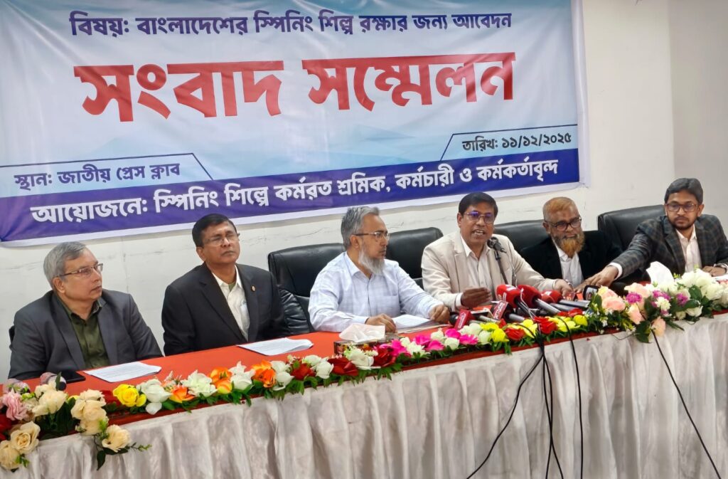 জাতীয় প্রেস ক্লাবে বৃহস্পতিবার আয়োজিত এক সংবাদ সম্মেলনে দেশের স্পিনিং শিল্পের সাথে যুক্ত লক্ষ লক্ষ শ্রমিক, কর্মচারী ও কর্মকর্তাদের চাকরি রক্ষায় জরুরি উদ্যোগ নেওয়ার জন্য সরকারের কাছে আকুল আবেদন জানানো হয়েছে। বক্তারা বলেন, তৈরি পোশাক শিল্পকে শক্তিশালী রাখার পেছনে স্পিনিং সেক্টরের অবদান অত্যন্ত গুরুত্বপূর্ণ হলেও সাম্প্রতিক বছরগুলোতে এই খাত অভূতপূর্ব সংকটে পড়েছে।