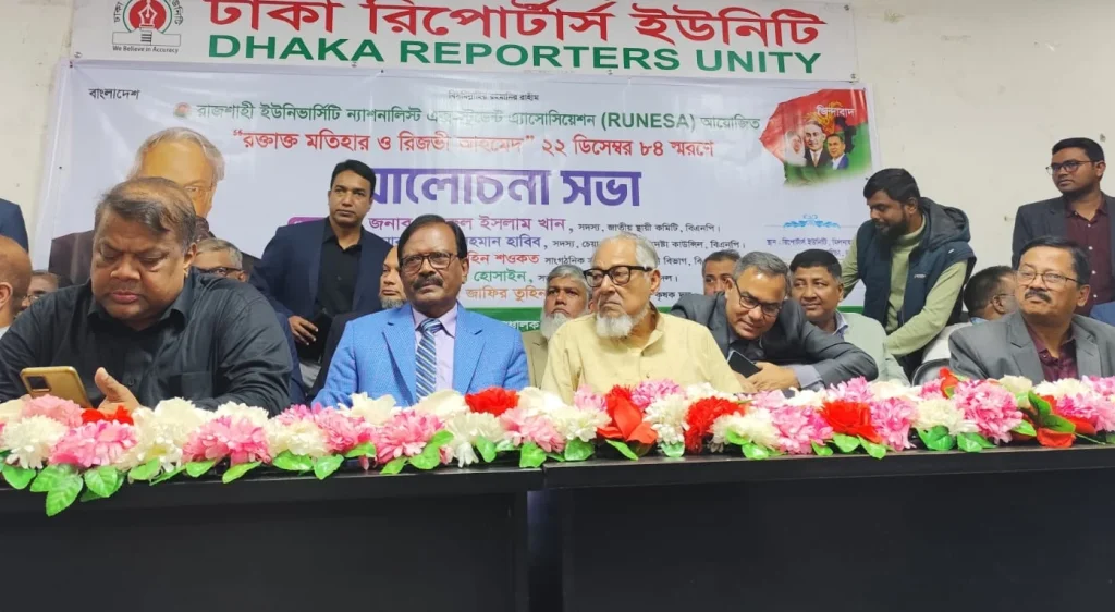 Thank you for reading this post, don't forget to subscribe!বৃহস্পতিবার দুপুরে ঢাকা রিপোর্টার্স ইউনিটিতে (ডিআরইউ) রাজশাহী ইউনিভার্সিটি ন্যাশনালিস্ট এক্স-স্টুডেন্ট এ্যাসোসিয়েশন আয়োজিত ‘রক্তাক্ত মতিহার ও রিজভী আহমেদ ২২ ডিসেম্বর ৮৪’ স্মরণে আলোচনা সভায় তিনি এসব কথা বলেন।