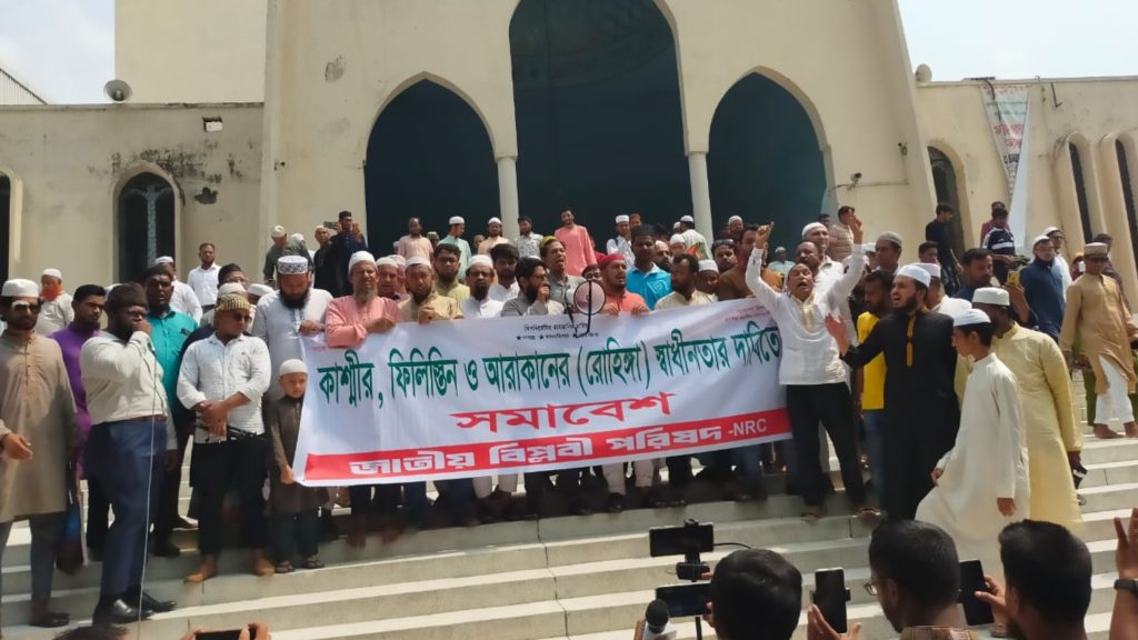 কাশ্মীর, ফিলিস্তিন ও আরাকান (মিয়ানমার) এর রোহিঙ্গা মুসলিম জনগোষ্ঠীদের স্বাধীনতা ও মানবাধিকারের দাবিতে রাজধানীর ঢাকা বায়তুল মোকাররম জাতীয় মসজিদের উত্তর গেইটে জুমার নামাজের শেষে একটি বিশাল প্রতিবাদ সমাবেশ অনুষ্ঠিত হয়েছে। “জাতীয় বিরোধী পরিষদ – NRC” এর ব্যানারে উক্ত কর্মসূচির আয়োজন অনুষ্ঠিত হয়।